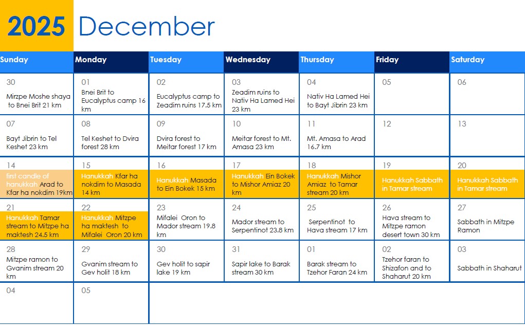 Israel National Trail hiking schedulle 2025-2026